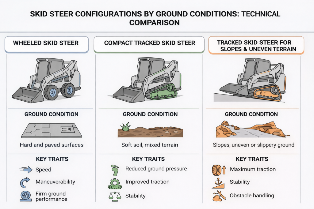Tracked skid steers are widely adopted where ground conditions change or stability is required. By spreading machine weight over a larger contact area, tracks reduce ground pressure and improve grip.