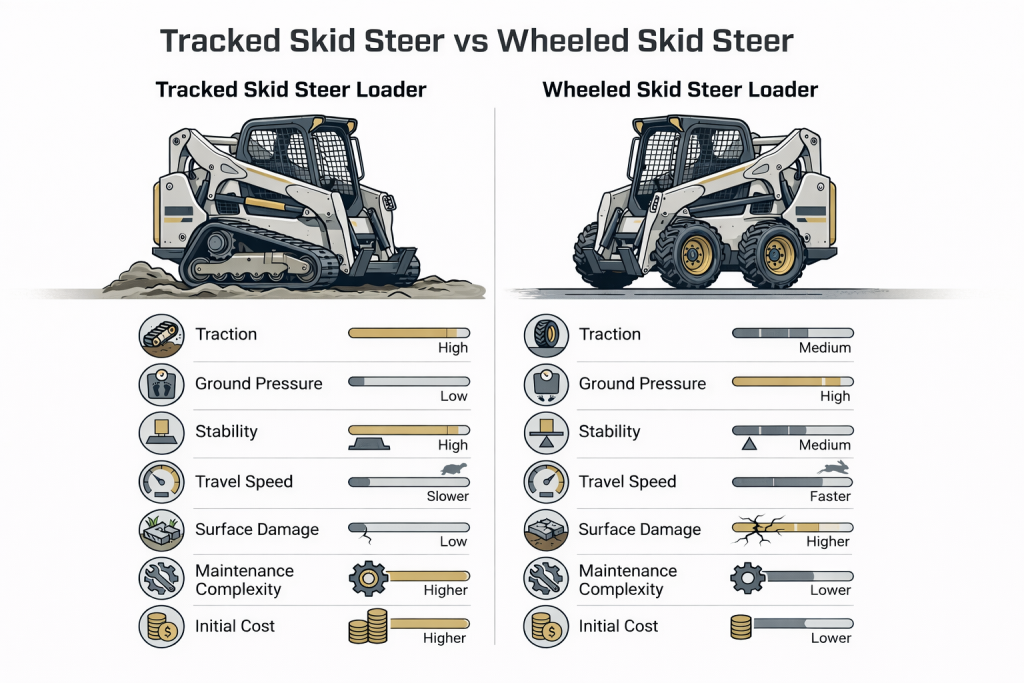 At a glance, the difference seems simple: one runs on rubber tracks, the other on tires. In practice, that single design choice affects traction, ground pressure, stability, maintenance, and cost.