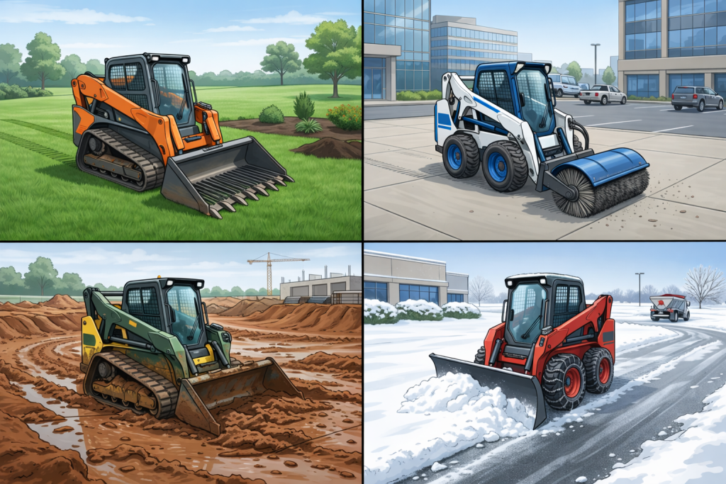 Tracked skid steers excel when traction and flotation matter more than speed.